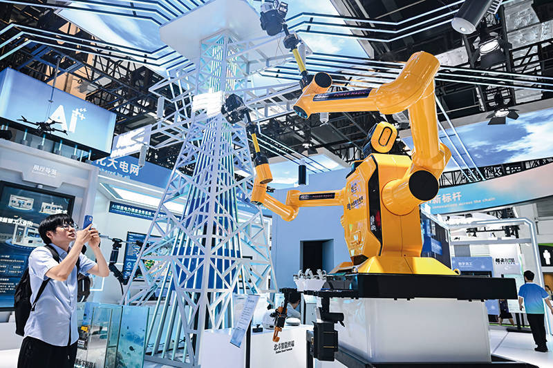 参观者在上海市举办的 2025 世界人工智能大会展览现场中国南方电网展区拍摄“悟空”带电作业机器人(2025 年7 月 28 日摄)陈浩明摄 / 本刊